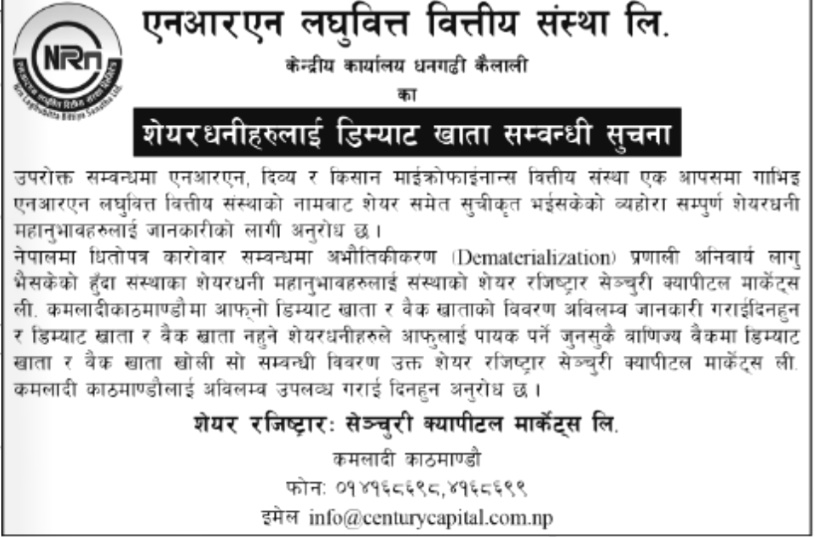 कम्पनीले किसान माइक्रोफाइनान्स र दिव्य लघुवित्तलाई प्राप्ति गरी एकीकृत कारोबार सुरु भइ एनआरएन लघुवित्त वित्तीय संस्था लिमिटेडको नामबाट नेप्सेमा शेयर समेत सूचिकृत भइसकेको छ ।कम्पनीकोे शेयर रजिष्ट्रार सेञ्चुरी क्यापिटल रहेको छ । कम्पनीले शेयरधनीहरुलाई उक्त क्यापिटलमा सम्पर्क गरी शेयर अभौतिकीकरण गर्न अनुरोध गरेको हो ।