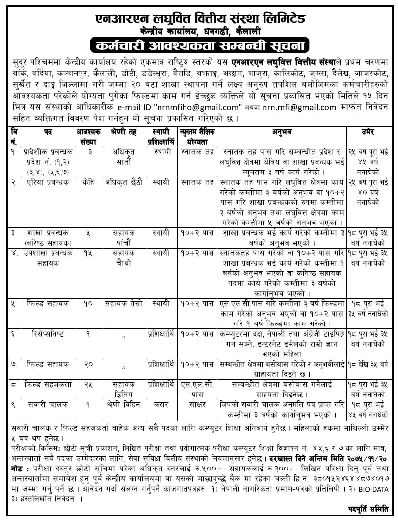 एनआरएन लघुवित्त वित्तिय संस्था लिमिटेडले विभिन्न ९ पदका लागि दरखास्त आहवन गरको छ । कम्पनीले विभिन्न २० शाखा कार्यालयहरुका लागि कर्मचारी माग गरेको छ ।