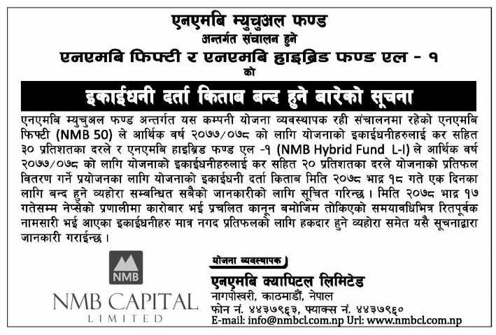 एनएमबि क्यापिटलका दुई योजनाको प्रतिफल वितरणका लागि बुक क्लोज मिति तय