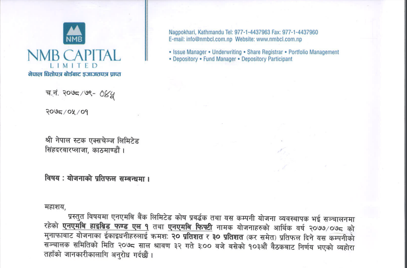 जस अनुसार एनएमबि हाइब्रिड फण्ड एल १ ले २० प्रतिशत तथा एनएमबि फिफ्टी नामक म्युचुअल फण्डले ३० प्रतिशत नगद लाभांश वितरण गर्ने जनाएका छन् ।