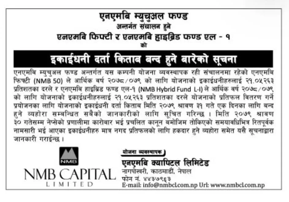 काठमाडौं । एनएमबि म्युचुअल फण्ड अन्तर्गत संचालित २ सामुहिक लगानी कोष एमएमबि फिफ्टी र एनएमबि हाईब्रिड फण्ड एल १ योजनाको प्रतिफल सुरक्षित गर्ने आज अन्तिम दिन रहेको छ । एमएमबि फिफ्टीले आर्थिक वर्ष २०७८/७९ को लागि योजनाको इकाईधनीहरुलाई २१ दशमलव ०५२६३ प्रतिशत नगद लाभांश वितरण गर्ने निर्णय गरेको हो।