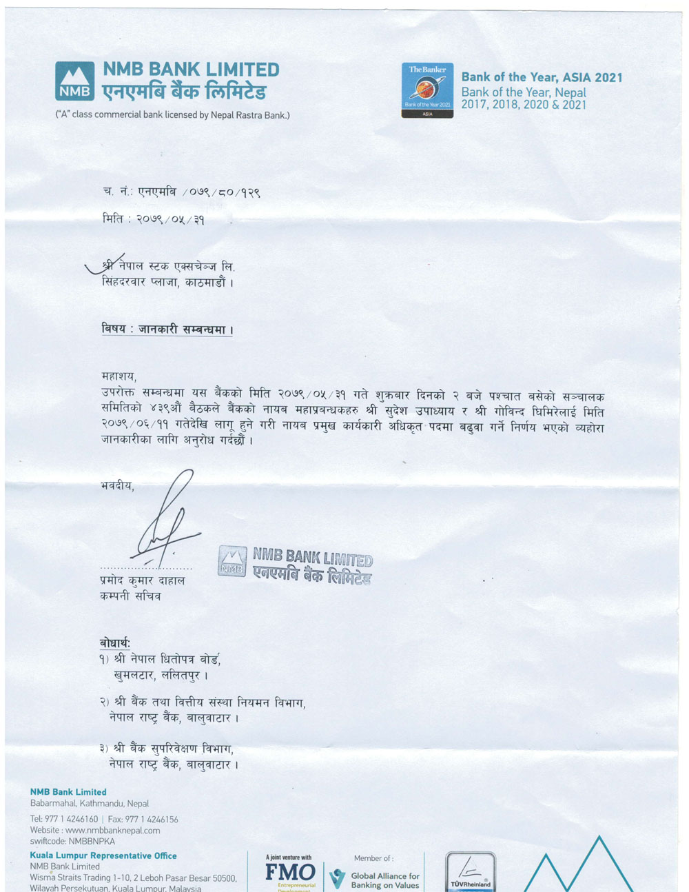 बैंकको भदौ ३१ गते बसेको संचालक समितिको बैठकले यस्तो निर्णय गरेको हो ।