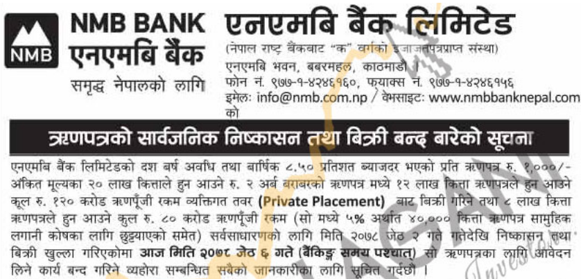 काठमाडौं । एनएमबि बैंक लिमिटेडको ऋणपत्रमा आवेदन दिने आज अन्तिम दिन रहेको छ । बैंकले जेठ २ गतेदेखि २ अर्ब रुपैयाँ बराबरको २० लाख कित्ता ऋणपत्र विक्री खुला गरेको थियो । बैंकले १० वर्षे अवधिको वार्षिक ८ दशमलव ५ प्रतिशत ब्याजदरमा ‘एनएमबि ऋणपत्र ८।५–२०८७र८८’ नामको ऋणपत्र निष्काशन गर्न लागेको हो ।
