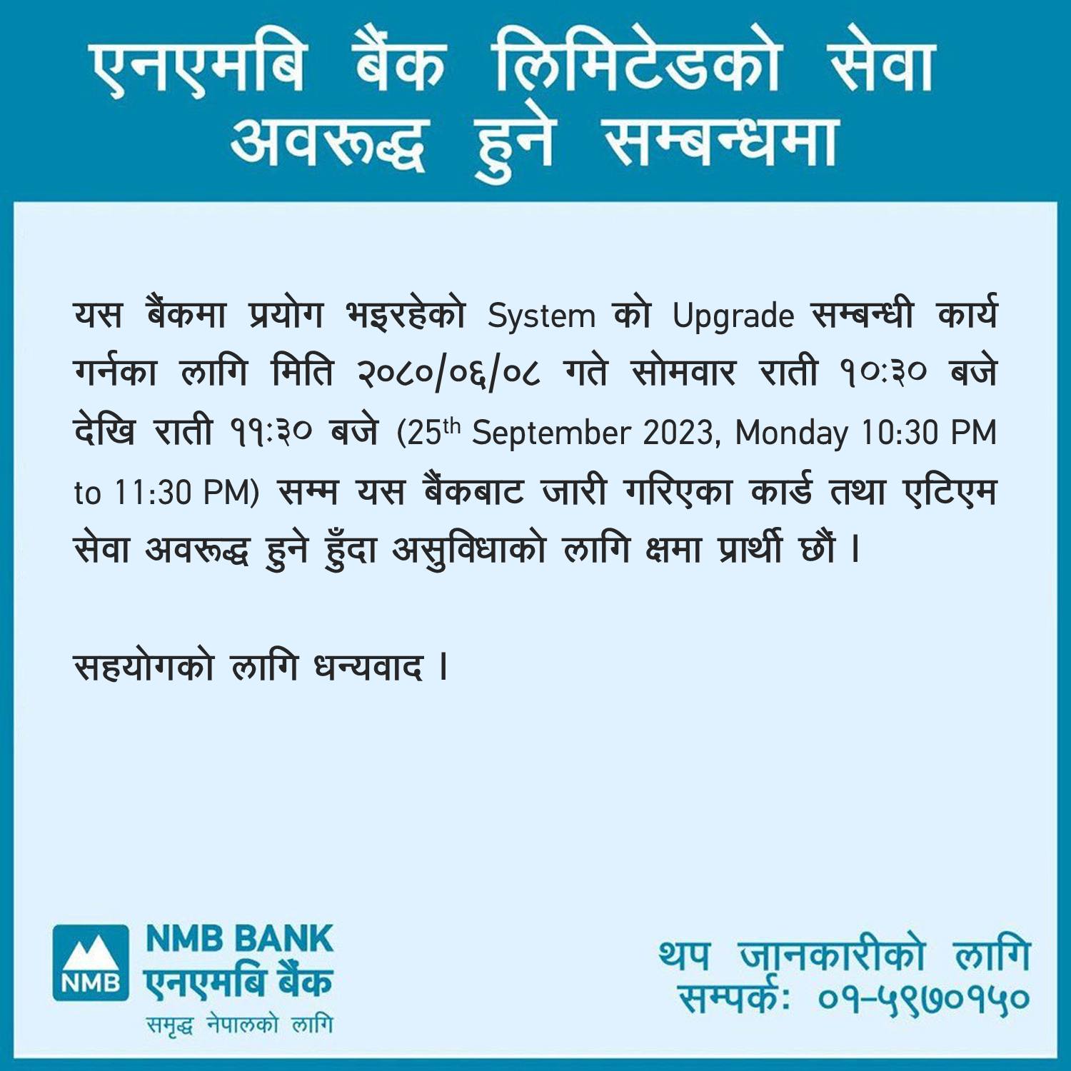 काठमाडौं । एनएमबि बैंक लिमिटेडको सेवा अबरुद्ध हुने भएको छ । बैंकमा प्रयोग भइरहेको सिस्टमको अपग्रेड सम्बन्धी कार्य गर्नका लागि सोमबार राती १०ः३० बजे देखि राती ११ः३० बजेसम्म बैंकबाट जारी गरिएका कार्ड तथा एटिएम सेवा अवरुद्ध हुने बैंकले जनाएको छ ।