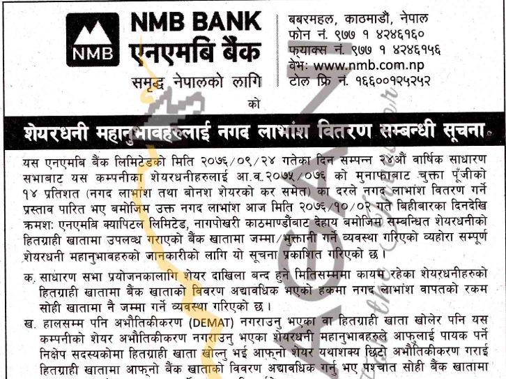 बैंकले साधारण सभा तथा लाभांश प्रयोजनका लागि बुकक्लोज मितिसम्ममा हितग्राही खातामा बैंक खाता अद्यावधिक गरेका शेयरधनीहरुको बैंक खातामा उक्त लाभांश जम्मा गर्नेछ ।