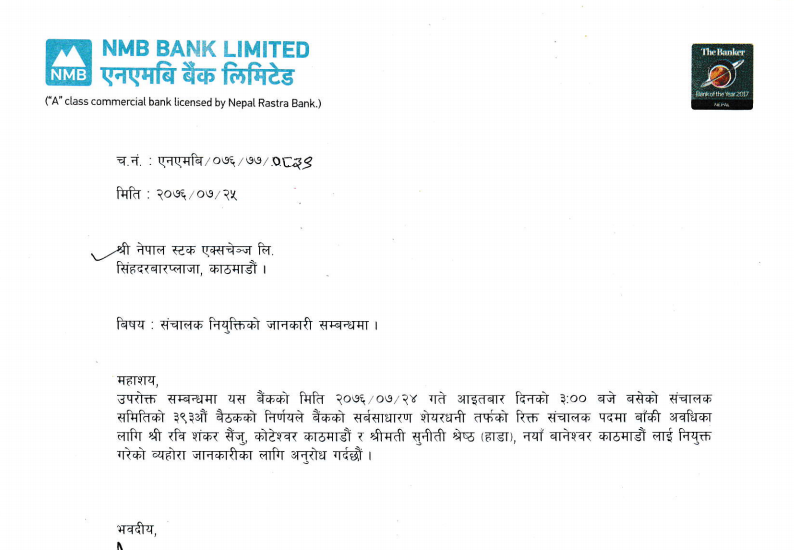 कम्पनीले रिक्त सञ्चालक पदमा बाँकी अवधिसम्म्का लागि कोटेश्वरका सैंजु र नयाँ बानेश्वरका श्रेष्ठलाई नियुक्त गरेको हो ।