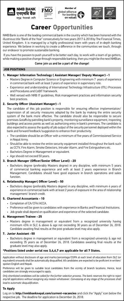 एनएमबि बैंक लिमिटेडले विभिन्न पदका लागि १५७ जना कर्मचारीहरु माग गरेको छ । बैंकले आइटी मेनेजर १ जना, सेक्युरिटी अफिसर १ जना, ब्रान्च मेनेजर २० जना, रिलेसनसिप मेनेजर ५० जना, चार्टर्ड एकाउन्टेन्ट १० जना, मेनेजमेन्ट ट्रेनि २५ जना, जुनियर असिस्टेन्ट ५० जना माग गरेको छ ।