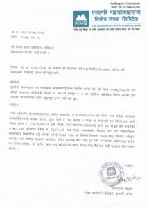 एनएमबि माइक्रोफाइनान्सले १५ प्रतिशत बोनस सेयर दिने भएको छ । कम्पनीले हाल कायम रहेको चुक्ता पूजीँ १४ करोड ८ लाख ७५ हजार रुपैयाँ को १५ प्रतिशत बोनस सेयर र यसमा लाग्ने कर तिर्न ०.७८९ प्रतिशत नगद लाभांश दिने निर्णय गरेको छ ।