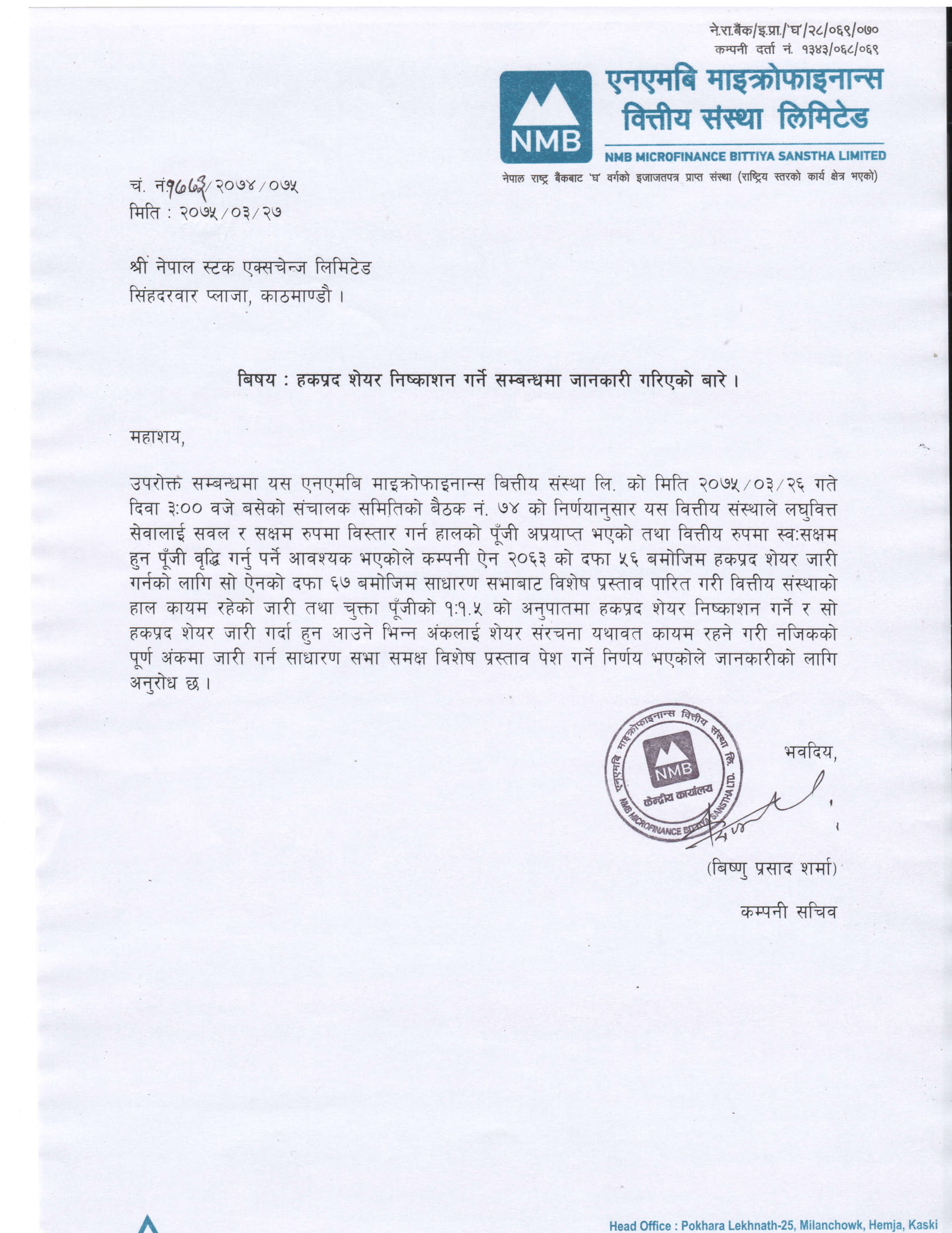 असार २६ गते बसेको सञ्चालक समितिको बैठकको निर्णय अनुसार कम्पनीले १ बराबर १ दशमलव ५ अनुपातमा हकप्रद शेयर बिक्री गर्ने विशेष प्रस्ताव साधारण सभामा लैजाँदै छ।