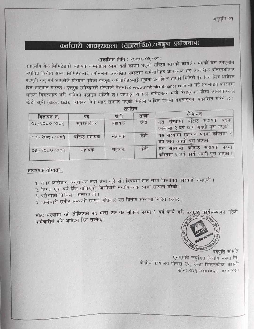 काठमाडौं । एनएमबि बैंकको सहायक कम्पनी एनएमबि लघुबित्तले विभिन्न पदका लागि कर्मचारी माग गरेको छ । बैंकले सुपरभाइजरका लागि केही, कनिष्ठ सहायकका लागि केही र सहायक पदका लागि केही संख्यामा कर्मचारी माग गरेको हो । उक्त पदहरुमा आवेदन दिनका लागि न्युनतम २ वर्षको अनुभव हुनुपर्ने कम्पनीले जनाएको छ । इच्छुक तथा योग्यता पुगेकाले सुचना प्रकाशित भएको मिति भदौ ९ गतेले १५ दिनभित्र आवेदन दिनुपर्नेछ ।