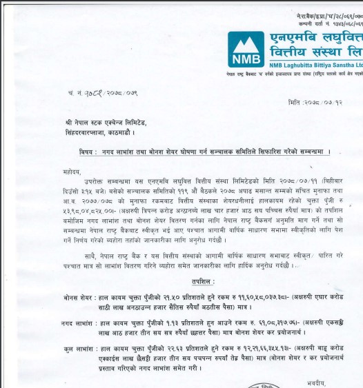 उक्त प्रस्तावित लाभांश नेपाल राष्ट्र बैंकले स्वीकृति दिएपछि र कम्पनीको आगामी साधारणसभाले पारित गरेपछि लगानीकर्ताले प्राप्त गर्नेछन् ।