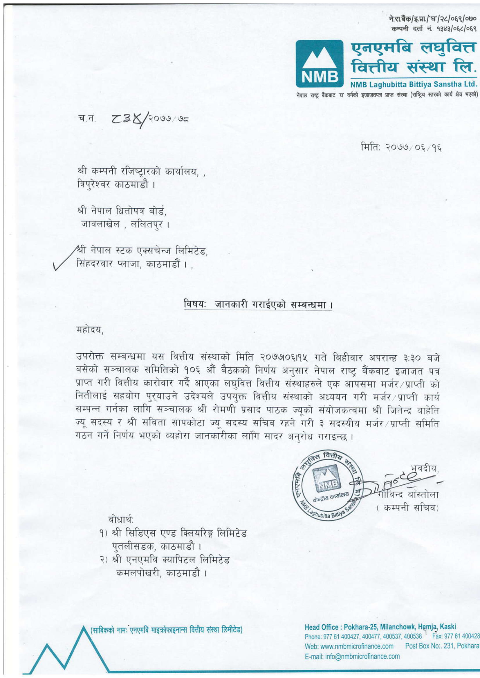 काठमाडौं । एनएमबि लघुवित्त वित्तीय संस्था लिमिटेडले मर्जर तथा प्राप्ति समिति गठन गरेको छ । संस्थाको हिजो असोज १५ गते बिहीबार बसेको सञ्चालक समितिको बैठकले नेपाल राष्ट्र बैंकबाट इजाजतपत्र प्राप्त गरी वित्तीय कारोबार गर्दै आएका लघुवित्त वित्तीय संस्थाहरूले एक आपसमा मर्जरको नितीलाई सहयोग पुर्याउने उद्देश्यले उपयुक्त संस्थासँग मर्जर तथा प्राप्तिको लागि अध्ययन गर्न मर्जर तथा प्राप्ति समिति गठन गरेको जनाको छ ।