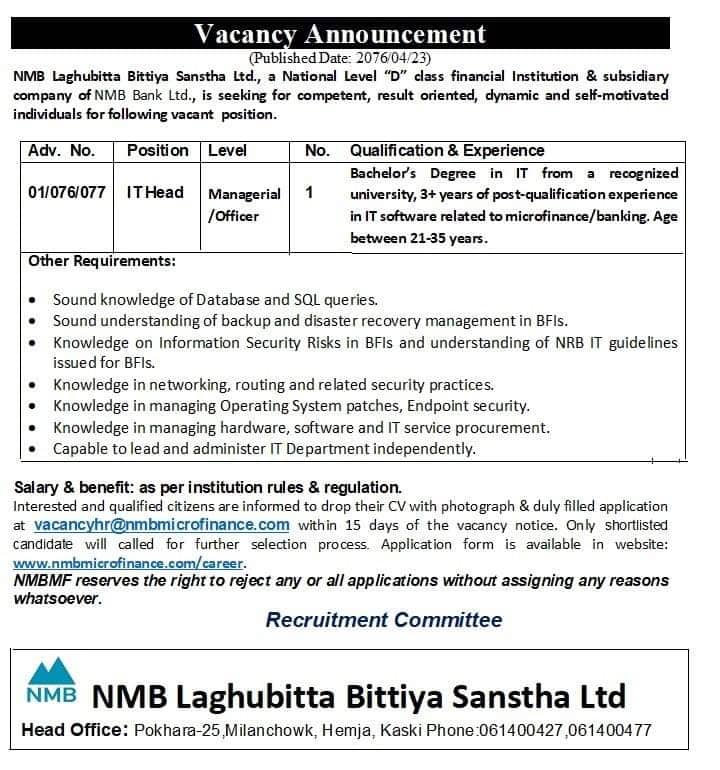 एनएमबि लघुवित्तले कर्मचारीको माग गरेको छ । लघुवित्तले आइटी हेडका लागि १ जना कर्मचारीको माग गरेको हो ।