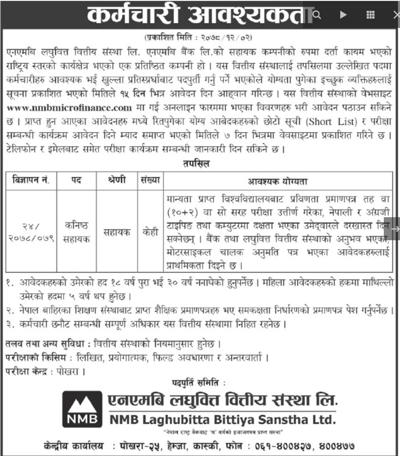 काठमाडौं । एनएमबि लघुवित्त वित्तीय संस्थाले कर्मचारीको माग गरेको छ । कम्पनीले कनिष्ठ सहायकका लागि कर्मचारकिो माग गरेको हो । कम्पनीले यस पदका लागि केही संख्यामा कर्मचारीको माग गरेको जनाएको छ । कम्पनीले आफ्नो कार्यालय तथा विभिन्न शाखा कार्यालयका लागि कर्मचारीको माग गरेको हो ।