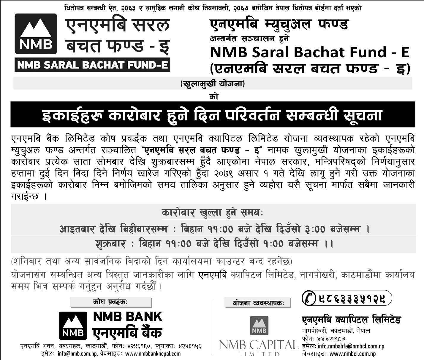 काठमाडौं । एनएमबि क्यापिटलको व्यवस्थापनमा एनएमबि म्युचुअल फण्ड अन्तर्गत सञ्चालित एनएमबि सरल बचत फण्ड–इ को इकाई कारोबार हुने दिन परिवर्तन भएको छ । यसअघि सोमवारदेखि शुक्रवारसम्म कारोबार हुँदै आएको उक्त इकाई अब असार १ गतेदेखि आइतवारदेखि शुक्रवारसम्म कारोबार हुने भएको हो ।