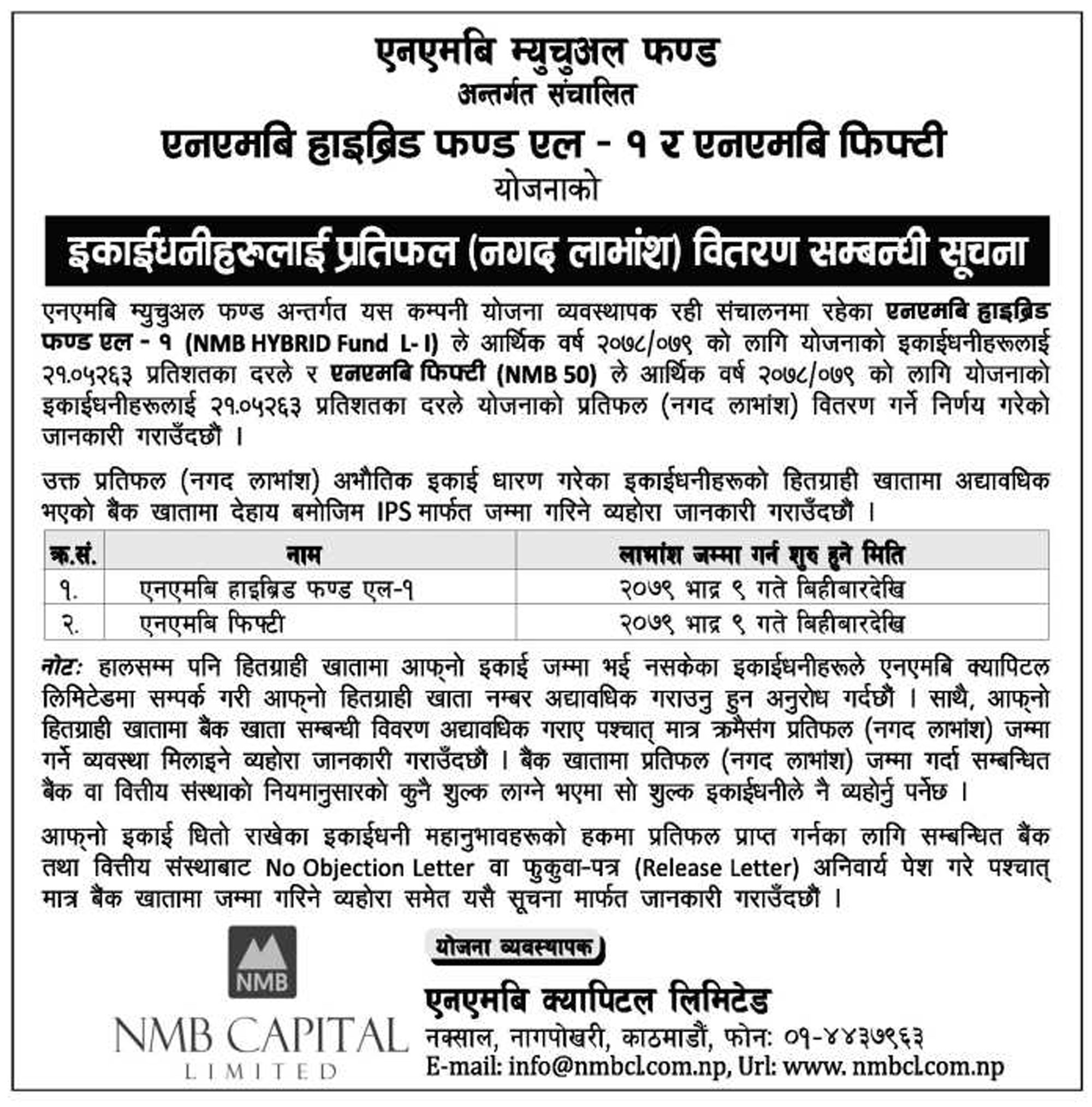 काठमाडौं । एनएमबि म्युचुअल फण्ड अन्तर्गत सञ्चालित एनएमबि हाइब्रिड फण्ड एल–१ र एनएमबि फिफ्टी योजनाले आफ्ना इकाईधनीहरुलाई प्रतिफल वितरण गरेका छन् । यी योजनाले एक सुचना जारी गर्दै नगद लाभांश वितरण गरेको जनाएका हुन् ।