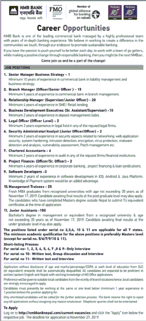 काठमाडौं । एनएमबी बैंकले विभिन्न पदका लागि १८६ जना कर्मचारी माग गरेको छ । बैंकले काठमाडौं उपत्यकाभित्र र बाहिरका सबै प्रदेशका लागि कर्मचारी माग गरेको हो ।