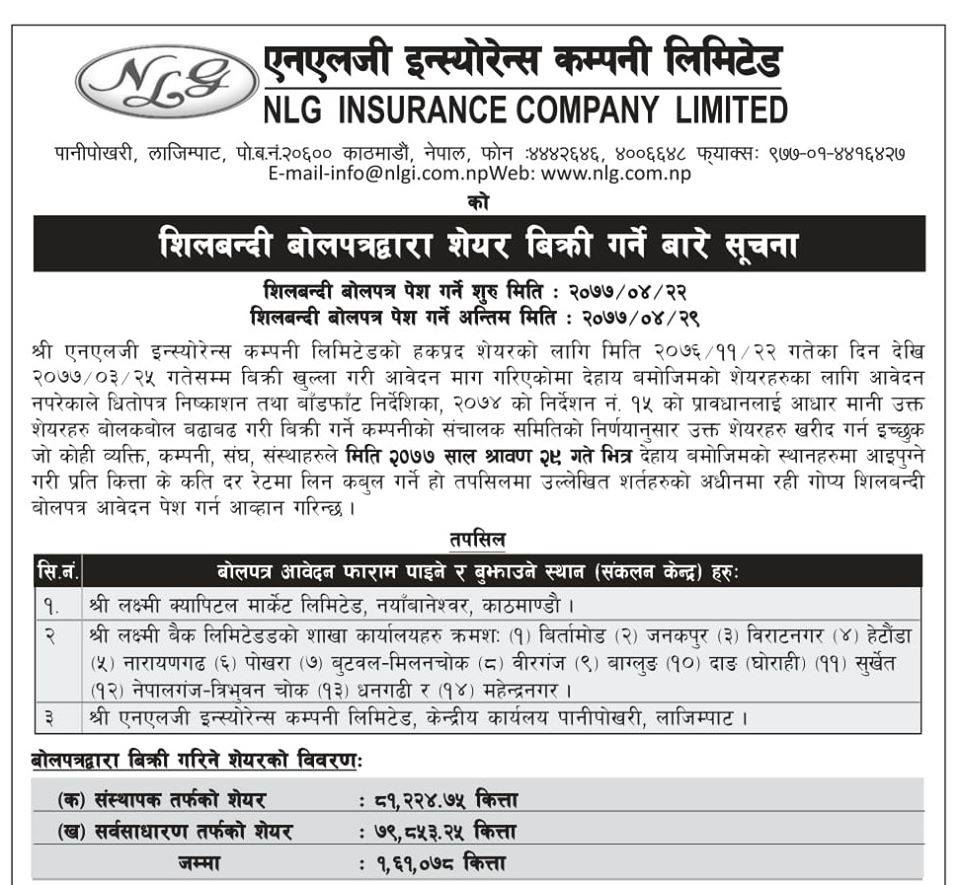 एनएलजी इन्स्योरेन्सले २०७६ फागुन २२ गतेबाट असार २५ गतेसम्म १० बराबर ६ अनुपातमा ३८ लाख ४२ हजार ४३७ कित्ता हकप्रद बिक्रीमा ल्याएकोमा ३६ लाख ८१ हजार ३५९ कित्ता मात्र बिक्री भएको थियो। सो शेयरमा आवेदन नपरेको शेयर बिक्रीमा ल्याइएको हो।