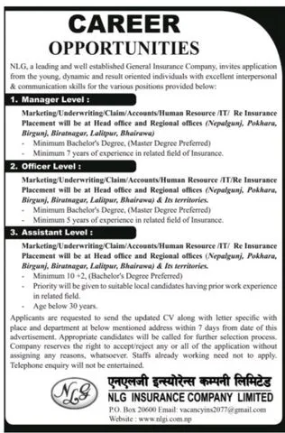 त्यसैगरी असिस्टेन्ट लेभलमा पनि कम्पनीले आइटी, रिइन्स्योरेन्स, लेभलमा मार्केटिङ, अण्डरराइटिङ,क्लेम, अकाउन्टस्, मानव संसाधनका लागि कर्मचारीको माग गरेको हो । कम्पनीले आफ्नो हेड अफिस, रिजनल अफिस र विभिन्न शाखा तथा उप शाखा कार्यालयका लागि कर्मचारीको माग गरेको हो ।