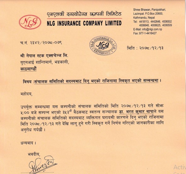 काठमाडौं । एनएलजी इन्स्योरेन्स कम्पनीका स्वतन्त्र सञ्चालक डा. भरत कुमार थापाले पदबाट राजिनामा दिएका छन् । कम्पनीको आइतवार बसेको सञ्चालक समितिको बैठकले चैत १३ गतेदेखि लागू हुने गरी उनले दिएको राजिनामा स्वीकृत गरेको हो । उनले आफ्नो पदबाट घरायसी कारण देखाएर राजिनामा दिएका हुन् ।