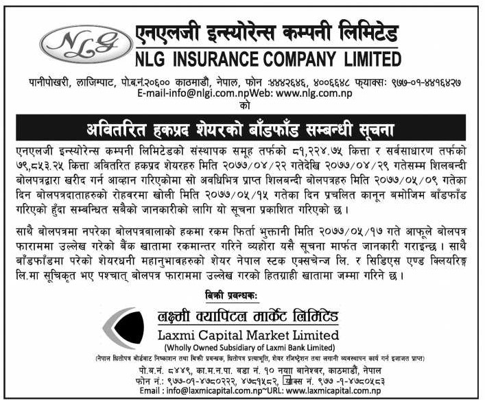 काठमाडौँ । एनएलजी इन्स्योरेन्स कम्पनी लिमिटेडले अवितरित हकप्रद शेयर बाँडफाँड गरेको छ ।