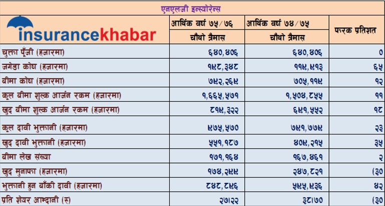 काठमाडौँ । एनएलजी इन्स्योरेन्स कम्पनीले आर्थिक वर्ष २०७५/७६ को चौथो त्रैमासको वित्तिय विवरण सार्वजनिक गरेको छ । कम्पनीले आर्थिक वर्ष ०७५/७६ को चौथो त्रैमाससम्म एक अर्ब ६६ करोड ५५ लाख ७१ हजार रुपैयाँ कुल बीमा शुल्क आर्जन गरेको छ ।