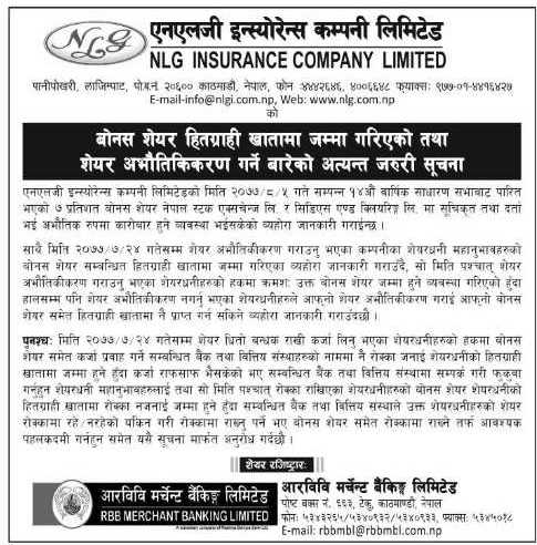 एनएलजी इन्स्योरेन्सको बोनश शेयर शेयरधनीको हितग्राही खातामा जम्मा
