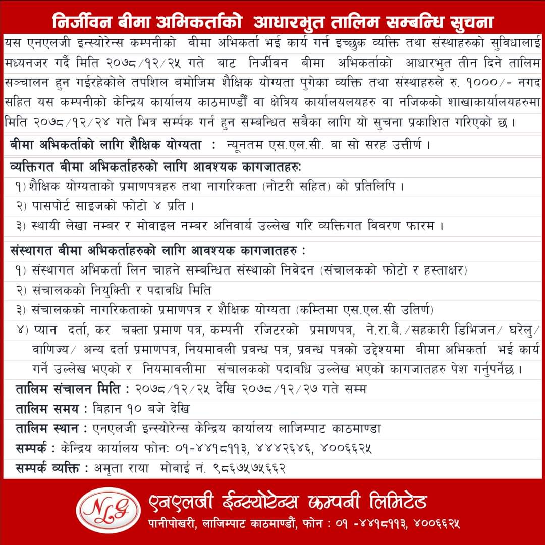 तालिम बिहान १० बजेदेखि शुरु हुने कम्पनीले जनाएको छ । तालिम एनएलजी इन्स्योरेन्स कम्पनीको केन्द्रीय कार्यालयमा हुनेछ ।