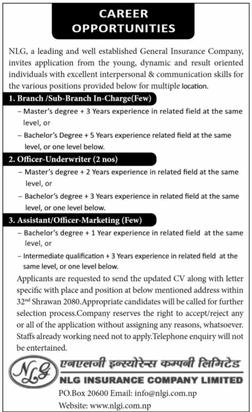 कम्पनीले शाखा र उपशाखाको इन्चार्ज पदका लागि केही संख्यामा दरखास्त आह्वान गरेको छ। यसैगरी अन्डरराइटरका लागि अधिकृत पदमा २ जना, र सहायक तथा बजार अधिकृत पदका लागी समेत केही संख्यामा कर्मचारी नियुक्तका लागी आवेदन माग गरेको हो ।