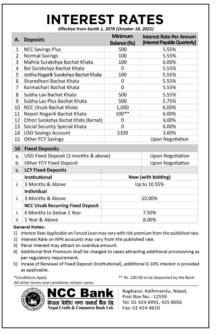 एनसीसीले ३ महिने वा सो भन्दा बढी अवधिको मुद्दति निक्षेपका लागी व्यक्तिगत ग्राहकलाई १० प्रतिशत र संस्थागत ग्राहकलाई १०.५५ प्रतिशत ब्याज प्रदान गर्ने घोषणा गरेको छ । साथै संस्थागत ग्राहकले मुद्दति निक्षेप नविकरण गरेको अवस्थामा थप ०.१० प्रतिशत ब्याज उपलब्ध गराउने समेत बैंकले जानकारी दिएको छ । भदौ अन्तिम सातादेखि बैंकहरुमा तरलताको अभाव चुलिएपछि वाणिज्य बैंक, विकास बैंक तथा फाइनान्स कम्पनीहरुले मुद्दति निक्षेपको ब्याज दर एकल अंकबाट दोहोरो अंकमा पु¥याएका थिए ।