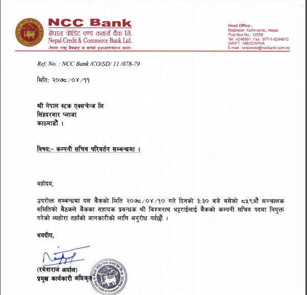 काठमाडौं । नेपाल क्रेडिट एण्ड कमर्स(एनसीसी) बैंकको कम्पनी सचिवमा विश्वनाथ भट्टराई नियुक्त भएका छन् । बैंकले एक सुचना जारी गर्दै बैंकको आइतवार बसेको सञ्चालक समितिको बैठकले भट्टराईलाई कम्पनी सचिवमा नियुक्त गरेको जनाएको छ । उनी बैंकमा सहायक प्रबन्धक रहेका थिए ।