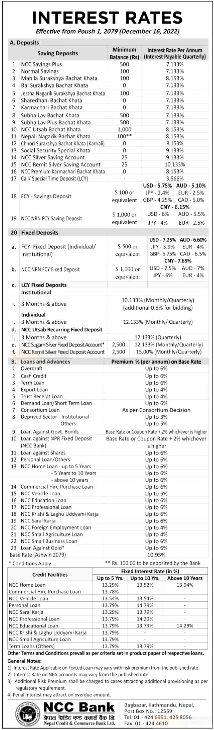 त्यस्तै, एनसीसी बैंकले मुद्दती निक्षेपतर्फ न्यूनतम १० दशमलव १३ प्रतिशतदेखि अधिकतम १५ प्रतिशतसम्म ब्याजदर दिने जनाएको छ ।