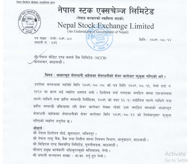 एनसीसी बैंकको मंसिर ८ गतेको पत्रानुसार नेप्सेले संगठित संस्थाको आधारभूत शेयरधनी बाहेकका शेयरधनीको शेयर कारोबार आजदेखि फुकुवा गरिदिएको हो ।