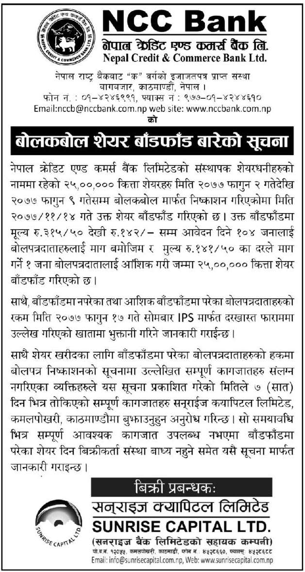 बाँडफाँडमा नपरेका तथा आंशिक बाँडफाँडमा परेका बोलपत्रदाताहरूको रकम भोलि फागुन १७ गतेदेखि रकमान्तर गरिने बैंकले जनाएको छ ।शेयर निष्काशन तथा बिक्री प्रबन्धकमा सनराइज क्यापिटल लिमिटेड रहेको छ ।