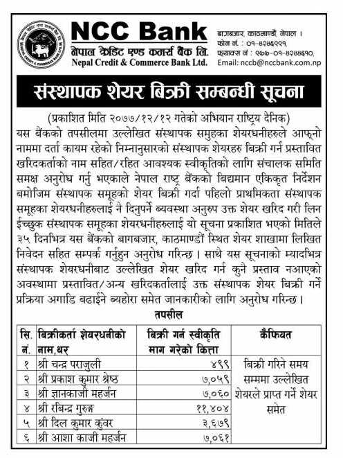 काठमाडौँ । नेपाल क्रेडिट एण्ड कमर्स बैंक लिमिटेडले संस्थापक समूहको शेयर बिक्री गर्ने भएको छ । बैंकले एक सूचना जारी गर्दै यस्तो जनाएको छ । बैंकका ६ जना संस्थापक शेयरधनीहरुले ३६ हजार ४ सय ६२ कित्ता संस्थापक शेयर विक्री गर्न लागेका हुन् ।