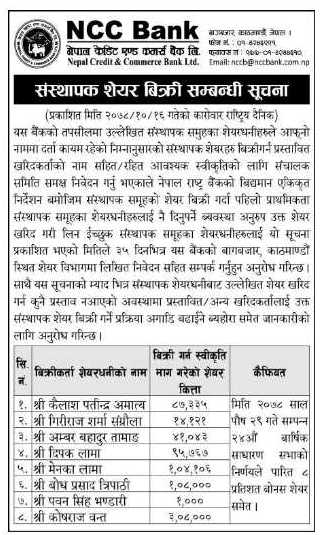 काठमाडौं । नेपाल क्रेडिट एण्ड कमर्स बैंक लिमिटेडले ७ लाख ५९ हजार ३ सय ७२ कित्ता संस्थापक शेयर बिक्री गर्ने भएको छ । बैंकका केही संस्थापक शेयरधनीहरूले आफ्नो नाममा रहेको शेयर बिक्री गर्न लागेको बैंकले एक सुचना जारी गर्दै जनाएको छ ।