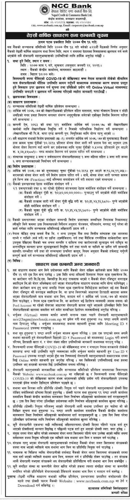 काठमाडौं । नेपाल क्रेडिट एण्ड कमर्स बैंक लिमिटेडको वार्षिक साधारण सभा माघ ९ गते हुने भएको छ । बैंकको पुस १५ गते, बिहीबार बसेको सञ्चालक समितिको बैठकले गरेको निर्णय अनुसार बैंकको २३औं वार्षिक साधारण सभा माघ ९ गते, शुक्रबार, बैंकको केन्द्रिय कार्यालय, बागबजार, काठमाडौँमा बिहान १० बजेदेखि भर्चुअल माध्यमबाट सञ्चालन हुने बैंकले जनाएको छ ।