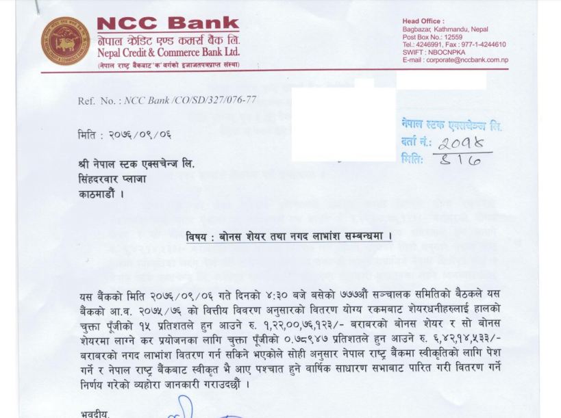 काठमाडौं । एनसीसी बैंकले १५ दशमलव ७९ प्रतिशत लाभांश दिने घोषणा गरेको छ । बैंकको आइतबार बसेको सञ्चालक समिति बैठकले गत वर्षको नाफाबाट १५ प्रतिशत बोनस सेयर र कर प्रयोजनका लागि ० दशमलव ७९ प्रतिशत नगद लाभांश दिने निर्णय गरेको हो ।