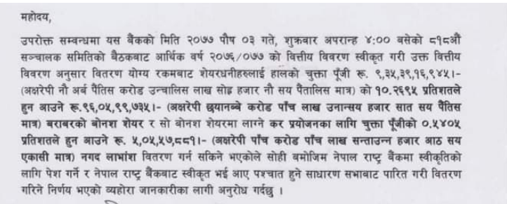 उक्त प्रस्तावित लाभांश नेपाल राष्ट्र बैंक र बैंकको आगामी वार्षिक साधारण सभाले अनुमोदन गरेपछि वितरण गरिनेछ ।