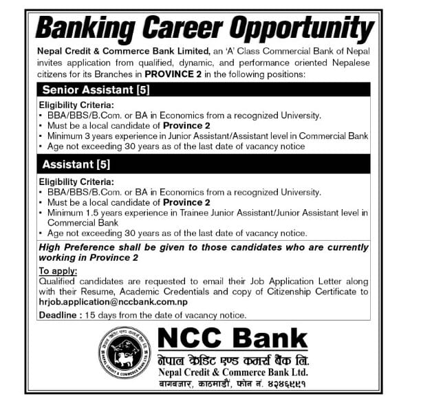 काठमाडौं । एनसीसी बैंकले विभिन्न पदका लागि कर्मचारीको माग गरेको छ । संस्थाले सिनियर असिस्टेन्टका लागि ५ जना र असिस्टेन्टका लागि ५ जना गरी १० जना कर्मचारको माग गरेको जनाएको छ ।