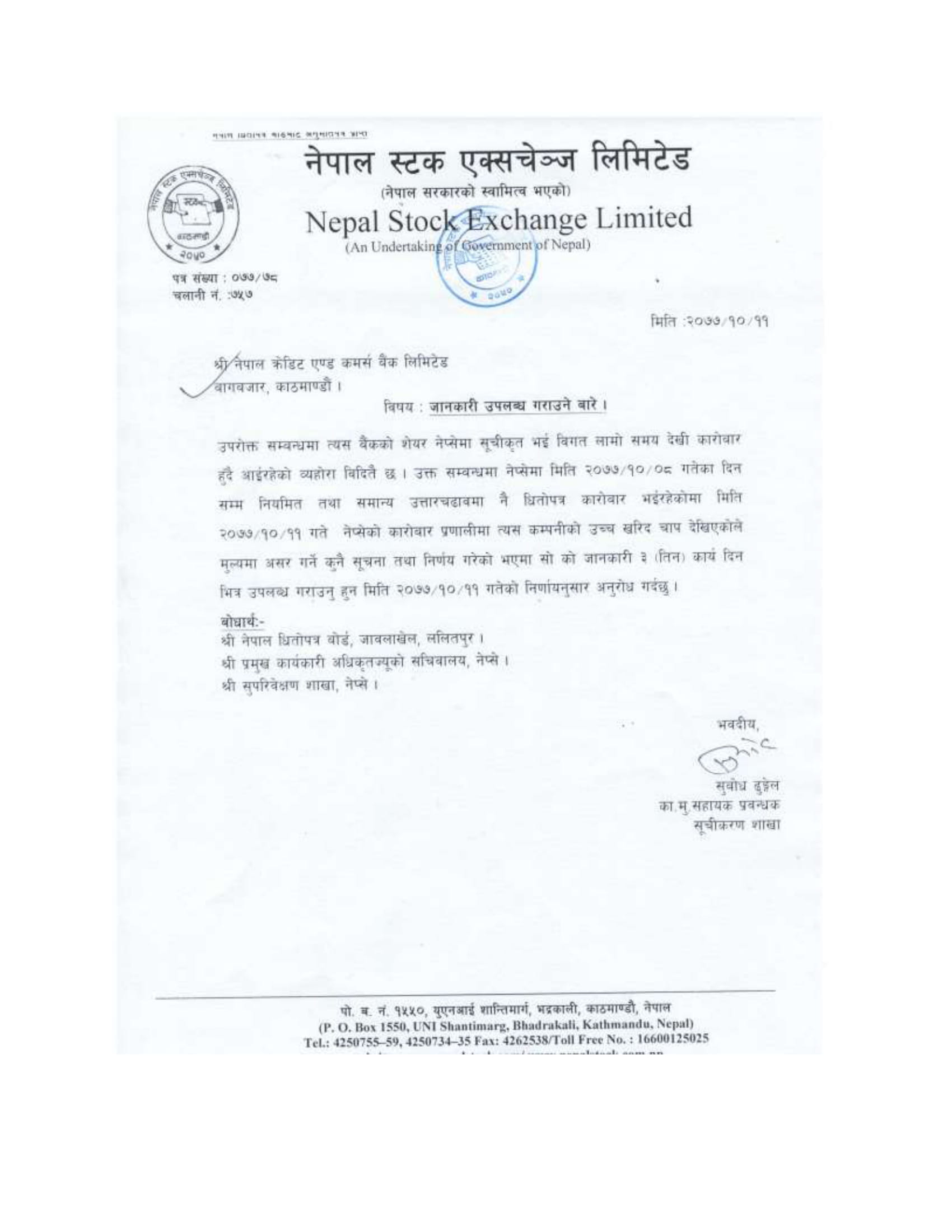 काठमाडौं । नेपाल क्रेडिट एण्ड कमर्स बैंक लिमिटेडलाई नेपाल स्टक एक्सचेञ्जले स्पष्टिकरण मागेको छ । नेप्सेले आइतबारको कारोबारमा बैंकको शेयरमा उच्च खरिद चाप देखिएको हुनाले शेयर मूल्यलाई असर गर्ने कुनै सूचना तथा निर्णय गरेको भए यस विषयमा के भएको हो र बैंकको भनाई के छ भन्ने विषय उल्लेख गरि ३ दिन भित्र स्पष्टिकरण पेश गर्न माग गरेको हो ।