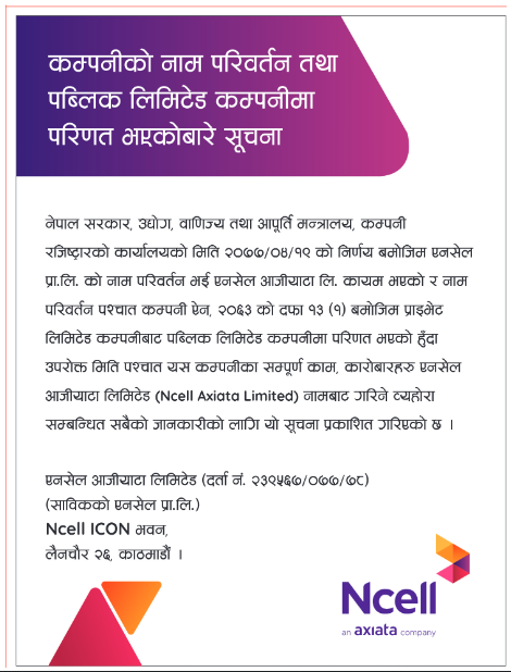 कम्पनी रजिष्ट्रारको निर्णयसँगै प्राइभेट लिमिटेड रहेको कम्पनीको नाम अब एनसेल आजियटा लिमिटेड रहेको छ । कम्पनी ऐन २०६३ को दफा १३ (१) बमोजिम प्राइभेट लिमिटेड कम्पनी पब्लिक कम्पनीमा रुपान्तरण हुने व्यवस्था छ ।