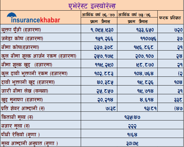 एभरेष्ट इन्स्योरेन्सको प्रथम त्रैमासको विवरण सार्वजनिक,प्रति शेयर आम्दानी ७ रुपैयाँ