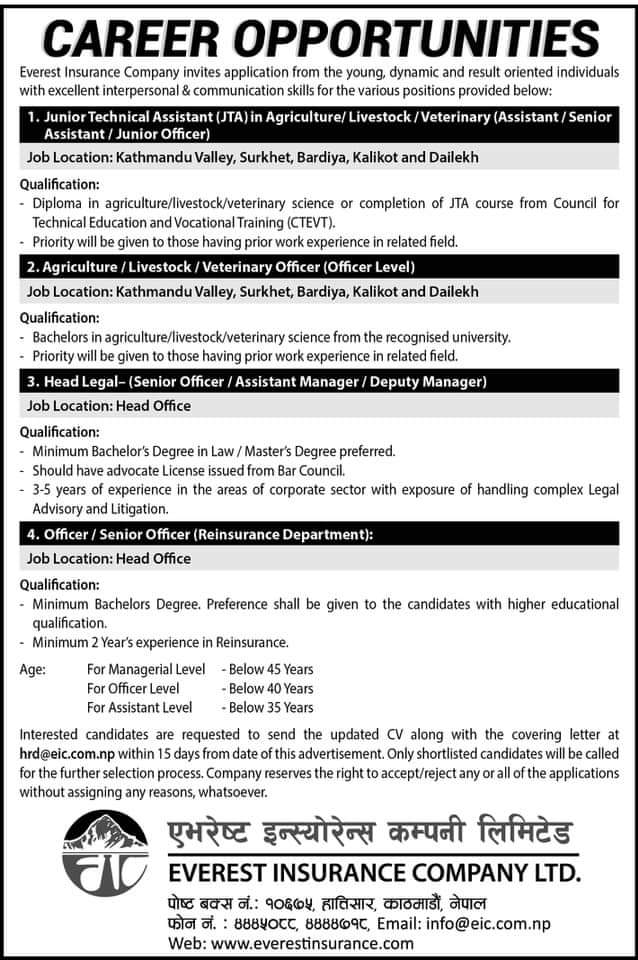 काठमाडौं । एभरेष्ट इन्स्योरेन्स कम्पनीले विभिन्न पदका लागि कर्मचारीको माग गरेको छ । कम्पनीले जुनियर टेक्निकल असिस्टेन्टका लागि केही, एग्रिकल्चर, लाइभस्टक र भेटनरीमा अफिसरलेभका लागि केही संख्यामा कर्मचारीके माग गरेको छ । त्यस्तै, हेड लेगलका लागि केही संख्यामा अफिसर, सिनियर अफिसरका लागि रि इन्स्योरेन्स डिपार्टका लागि केही संख्यामा कर्मचारीको मगा गरेको छ ।