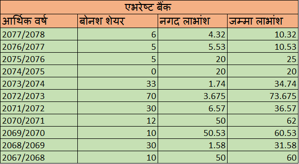 काठमाडौं । एभरेष्ट बैंकले इतिहासकै सर्वाधिक कम लाभांश दिएको छ । दोस्रो बजारमा सबैभन्दा राम्रो लाभांश दिने बैंकले पछिल्लो दुई आर्थिक वर्षमा बैंकले १० प्रतिशत हाराहारीमै सिमित गरेको छ । बैंकको आज बसेको सञ्चालक समितिको बैंठकले ६ प्रतिशत बोनश शेयर र बोनश शेयरमा लागि कर प्रयोजन सहित ४.३२ प्रतिशत नगद लाभांशको प्रस्ताव गरेको छ । बैंकले गत आर्थिक वर्षमा ५ प्रतिशत बोनश शेयर र ५.५३ प्रतिशत नगद लाभांश दिएको थियो ।
