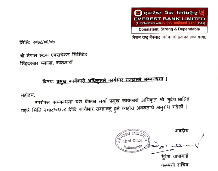 काठमाडौं । एभरेष्ट बैंकमा पहिलो पटक नेपाली सिइओ सुदेश खालिङले कार्यभार सम्हालेका छन् । बैंकको सञ्चालक समितिले ५ हिना अगाडि नै नियुक्ति दिए पनि कुलिङ पिरियडका कारण कार्यभार सम्हाल्न पाएका थिएनन् ।