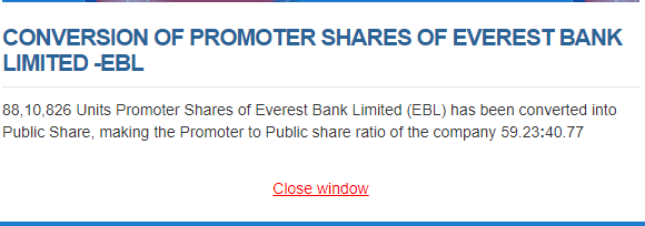 काठमाडौं । एभरेष्ट बैंकको संस्थापक शेयर सर्बसाधारणमा परिणत भएको छ। बैंकको ८८ लाख १० हजार ८ सय २६ कित्ता संस्थापक शेयर सर्वसाधारण समुहमा परिणत भएको हो।