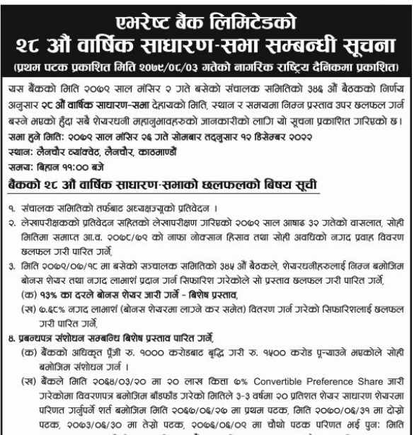 काठमाडौं । एभरेष्ट बैंकले आफ्नो २८औं वार्षिक साधारण सभा आज मंसिर २६ गते गर्दैछ । बैंकले उक्त सभा लैजचौर ब्यांक्वेट लैनचौर काठमाडौंमा गर्ने जनाएको छ । सभा विहान ११ बजे गर्नेछ । कम्पनीको मंसिर २ गते बसेको संचालक समितिको बैठकले उक्त सभाको मिति तय गरेको हो ।