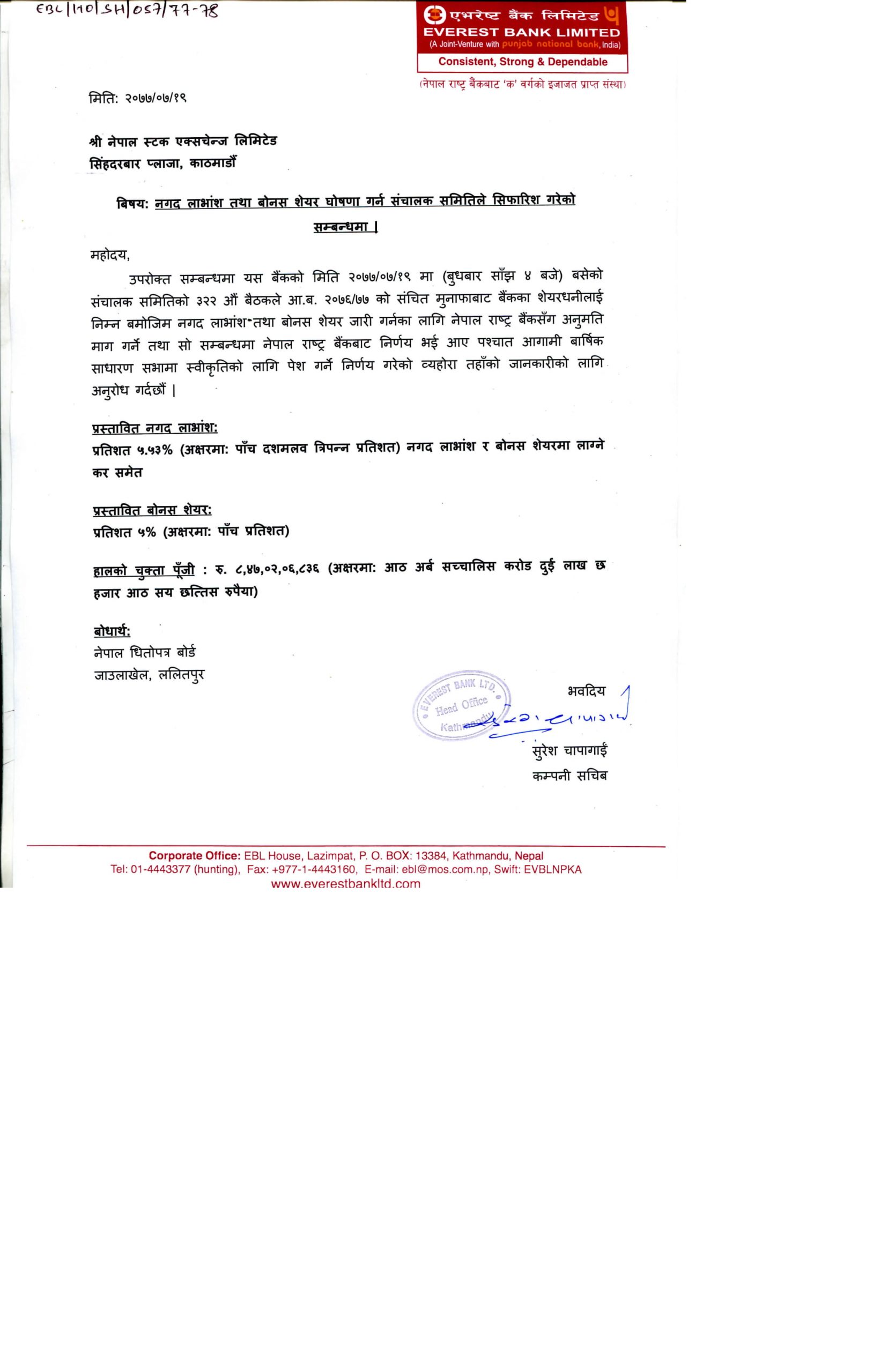 उक्त प्रस्तावित लाभांश नेपाल राष्ट्र बैंक र आगामी वार्षिक साधारण सभाले अनुमोदन गरेपछि लगानीकर्ताले पाउनेछन् ।