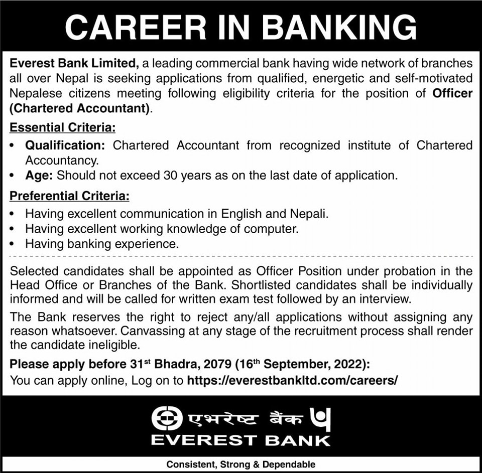 काठमाडौं । बैंकले कर्मचारीको माग गरेको छ । बैंकले अफिसर चार्टर्ड अकाउन्टेन्टका लागि कर्मचारकिो माग गरेको हो । सम्बन्धीत विषयमा ज्ञान भएको हुनुपर्ने बैंकले जनाएको छ । ईच्ुक तथा योग्यता पुगेकाले भदौ ३१ गते बैंकिङ समयभित्र आवेदन दिनुपर्नेछ ।